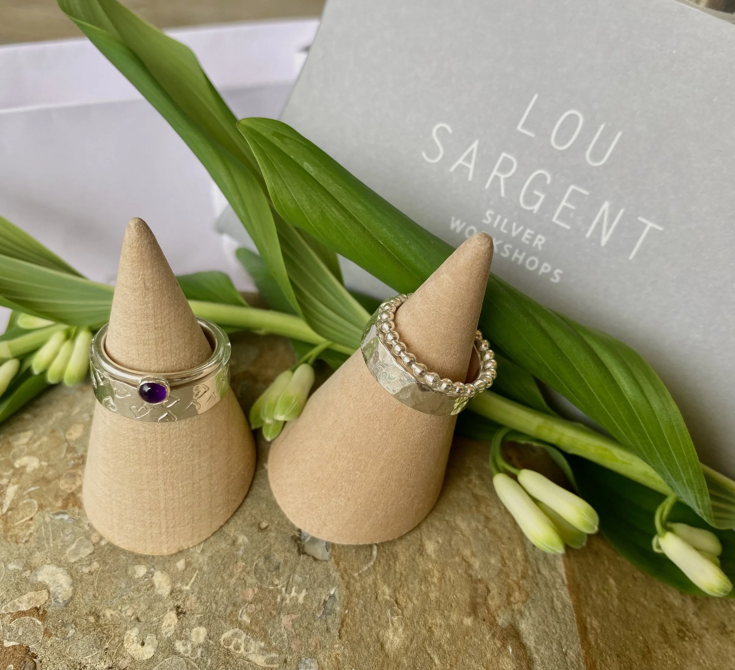 In this workshop you will make a simple chunky sterling silver ring with a smooth or hammered finish. These rings can be personalised with initials and motif stamping (optional).
